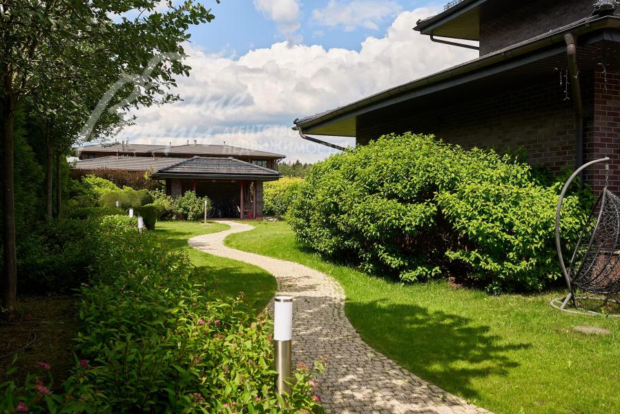 Дополнительная информация о доме: Дом в стиле органической архитектуры Френка Ллойда Райта. Все материалы, использованные при строительстве дома, произведены в Германии. Краски от ведущих производителей Великобритании и США обеспечивают экологичность и долговечность покрытия. Терраса выполнена по технологии «сухого пола» с итальянской плиткой. Камин с керамическим дымоходом подключён к общей системе отопления. Архитектурный бетон использован для оформления оконных проемов.